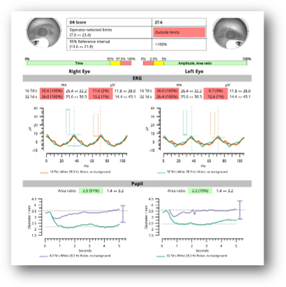 ERG testing demonstrated severely delayed implicit time OU and significantly reduced amplitude OU. Both parameters were flagged abnormal. The DR Score was 27.6, which is significantly above the normal reference range of 7.0 to 23.4 (Figure 4).