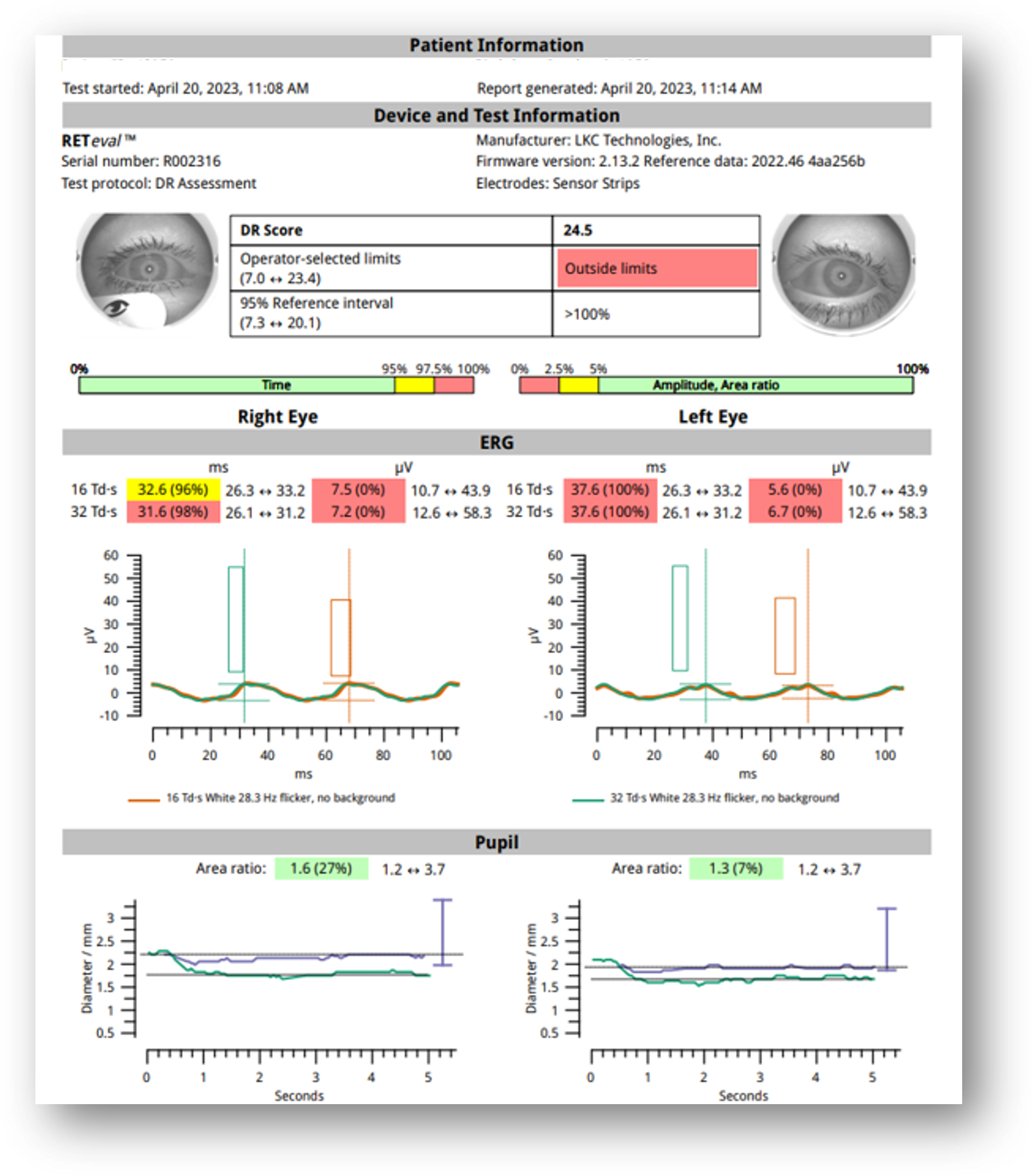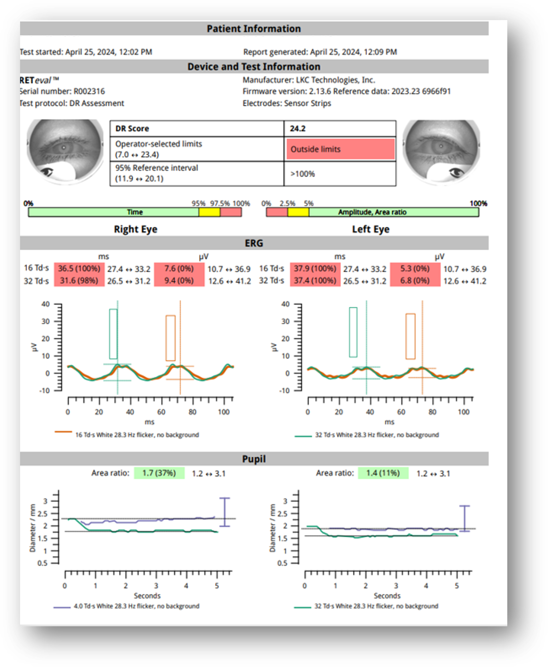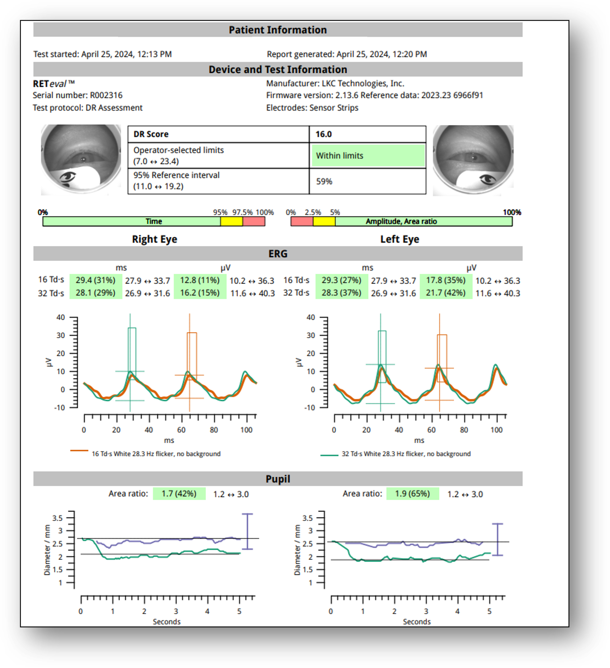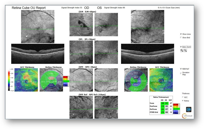 ERG testing showed a DR Score of 16.0, which is well within normal limits (Figure 9). Additionally, I noted only mild asymmetry in amplitude (OS > OD). These results were reassuring given the patient’s systemic risk factors.