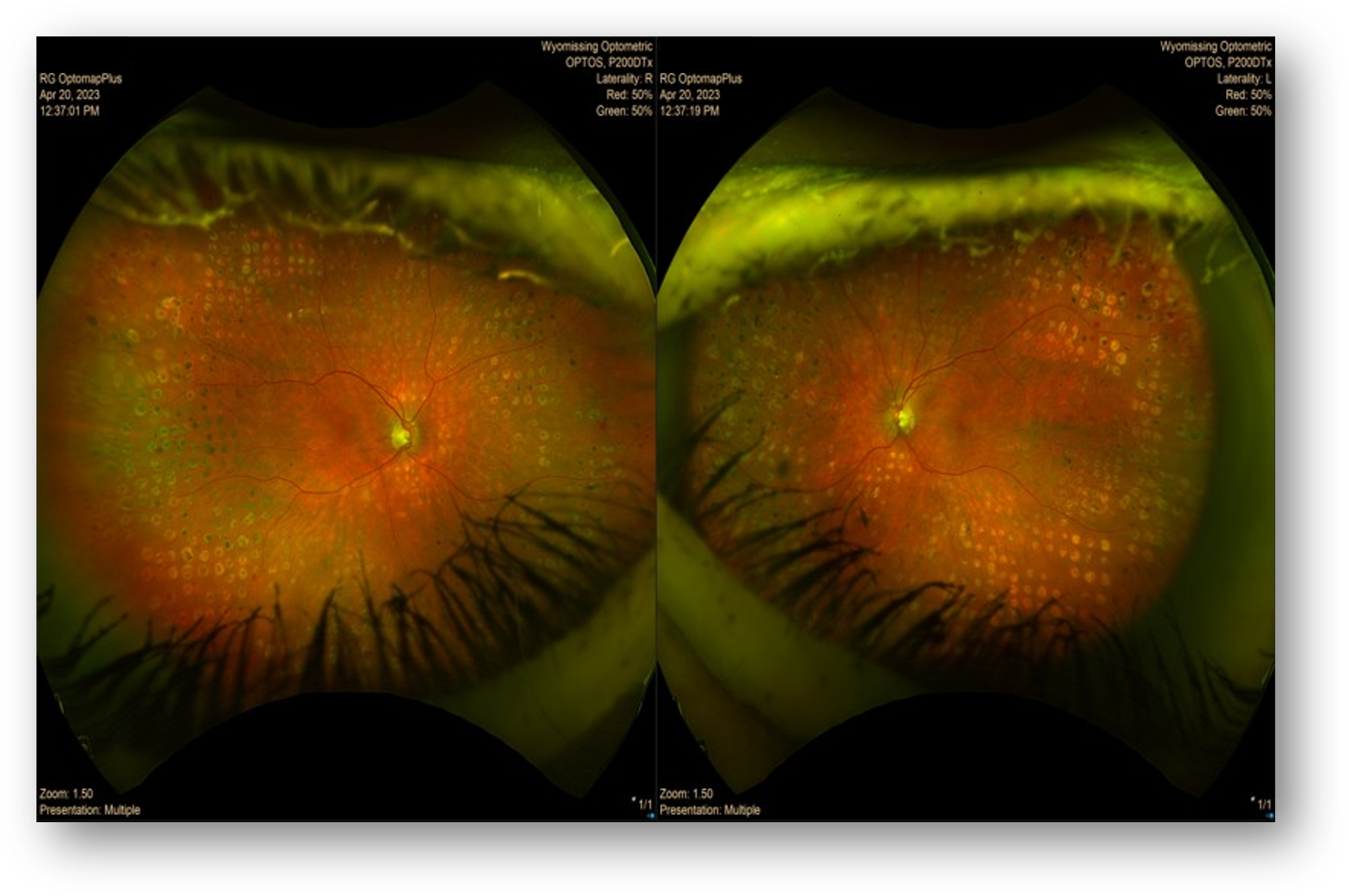 A married couple, both of whom have a history of diabetes, presented on the same day for routine comprehensive vision examinations. Neither patient reported any new vision complaints, and their eyesight was easily correctable to 20/20 with minimal change in refractive error.