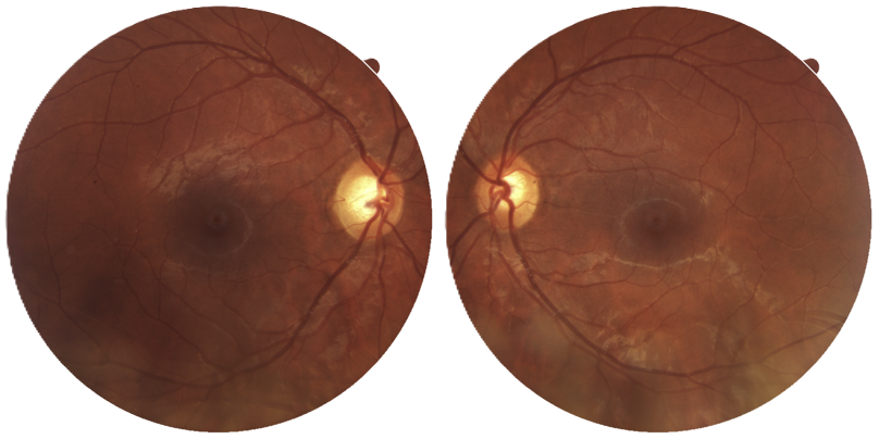 A 27-year-old male glaucoma suspect was referred to an ophthalmologist to obtain a definitive diagnosis. The patient did not report any visual complaints. His best corrected visual acuity (BCVA) was 20/20 in both eyes. His pressures using the iCare device was 17 mmHg binocularly. During examination of the posterior segment, large optic discs were noted at the level of the fundus, with clear borders and no signs of atrophy.