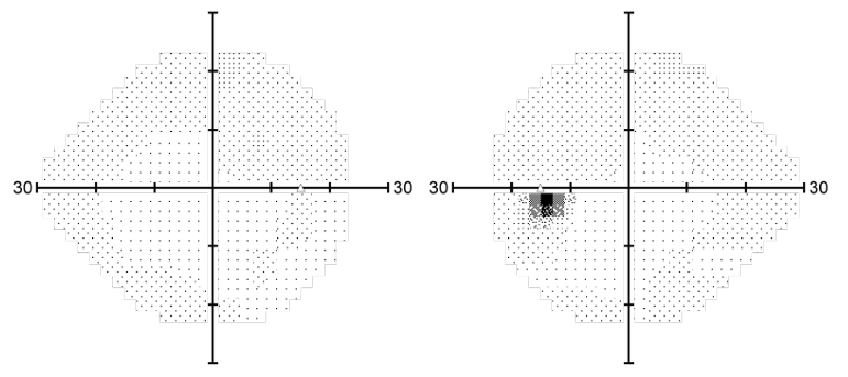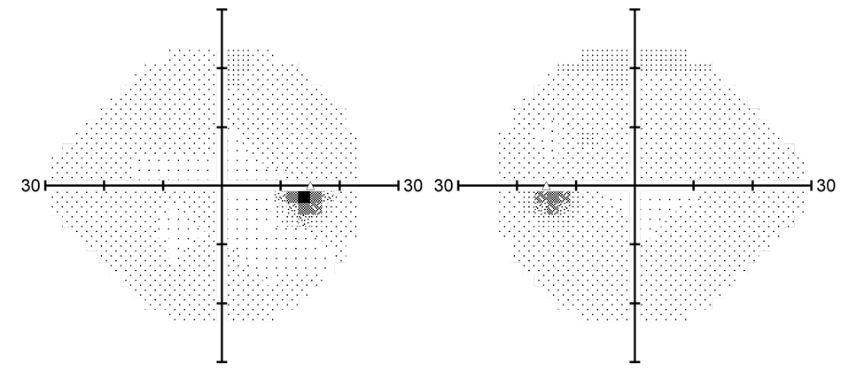 Normal PhNR results supported the conclusion that the large optic disc represented a variant of normality rather than glaucoma, and observation was initiated. Preventive use of citicoline tablets was recommended. A follow-up visit was performed 2 years later. The BCVA was 20/20. Intraocular pressure was lower at 14 mmHg. OCT (Figure 5) and visual field (Figure 6) results did not reveal any changes, and the PhNR result was -5.0 μV and -6.4 μV for the right and left eyes, respectively (Figure 7).