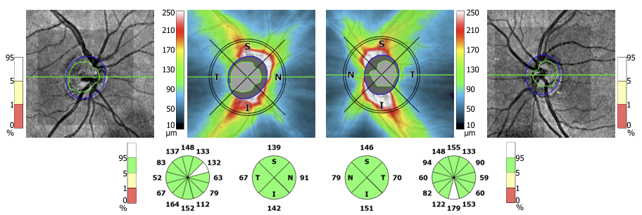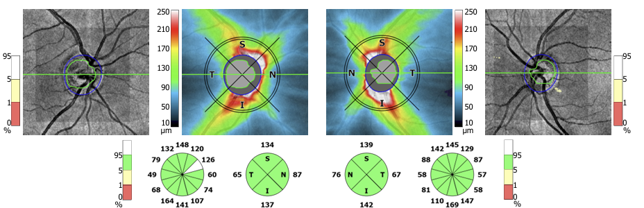 An OCT examination using SD OCT (Revo, Optopol, Poland) was ordered, which showed a normal RNFL profile and thickness (Figure 1). The area of the optic disc OD was 2.68 mm2 and OS was 2.23 mm2, and the c/d ratio OD was 0.54 and OS 0.45 (Figure 2). Humphrey static perimetry was performed using 24-2 SITA strategy, the result of which was within normal limits (Figure 3). To objectively assess the activity of retinal ganglion cells, a photopic negative response (PhNR) test was performed using the RETeval device from LKC Technologies.