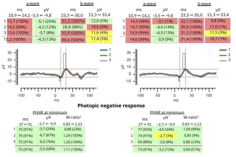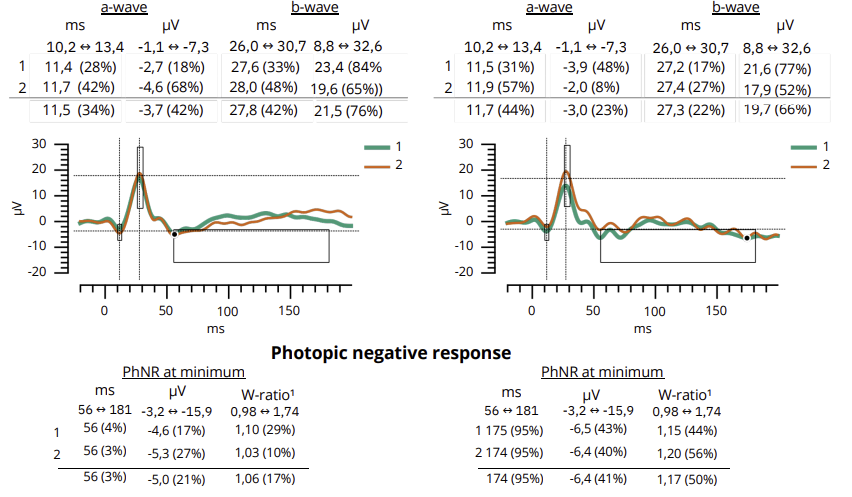 The PhNR amplitude at minimum for the right eye was -5.5 μV and -3.2 μV for the left eye (Figure 4). These results are within the normal limits.