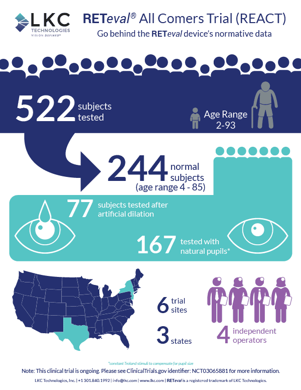 The reference intervals come from an ongoing clinical trial, the RETeval All Comers Trial (REACT), sponsored by LKC Technologies (More on ClinicalTrials.gov). The study was conducted in five locations in three states utilizing an IRB approved protocol. All subjects completed informed consent forms.