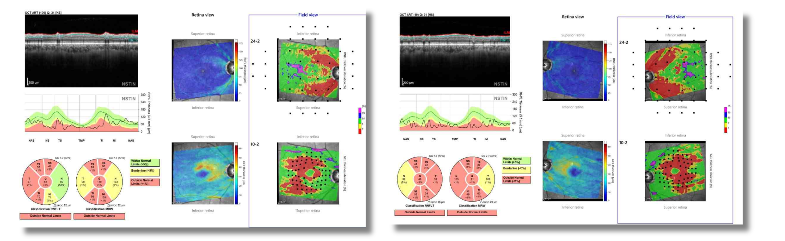 RETeval provided an objective, non-invasive way to monitor progression of ganglion cell function. In this patient, the ERG confirmed functional stability despite severe structural damage, even in the absence of visual field testing.