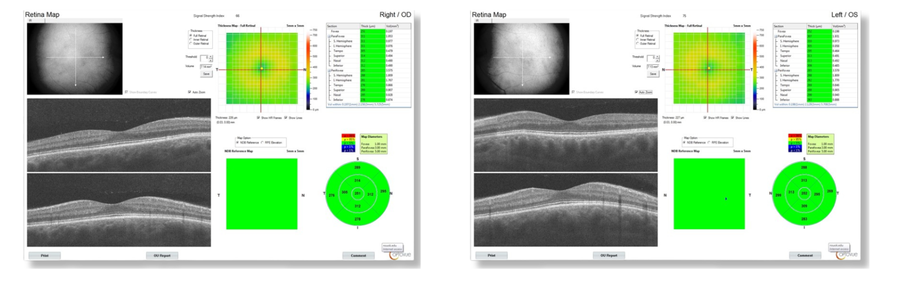 Based on the OCT (Figure 2), we would expect this patient to have 20/20 vision, yet he had reduced visual acuity in the left eye and was complaining about it, particularly as it compared to the reduced vision in his right eye.