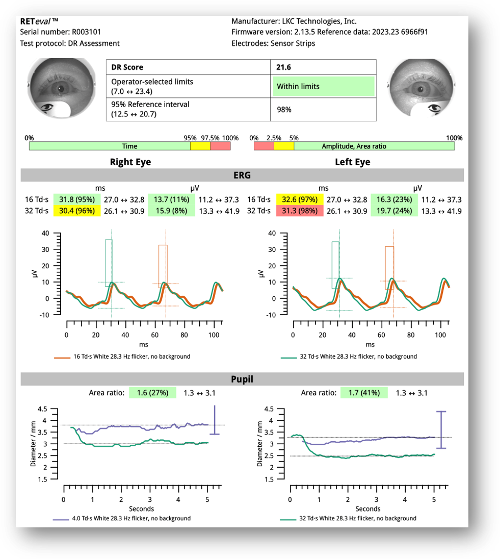 Although the DR Score is less than 23.5 at 21.6, the implicit times are flagged as borderline and abnormal, which is indicative of cellular stress. In addition, the DR Score of 21.6 does fall outside of the 95% reference interval for this patient’s age group, which alerts us to this being a borderline ERG result (Figure 3).