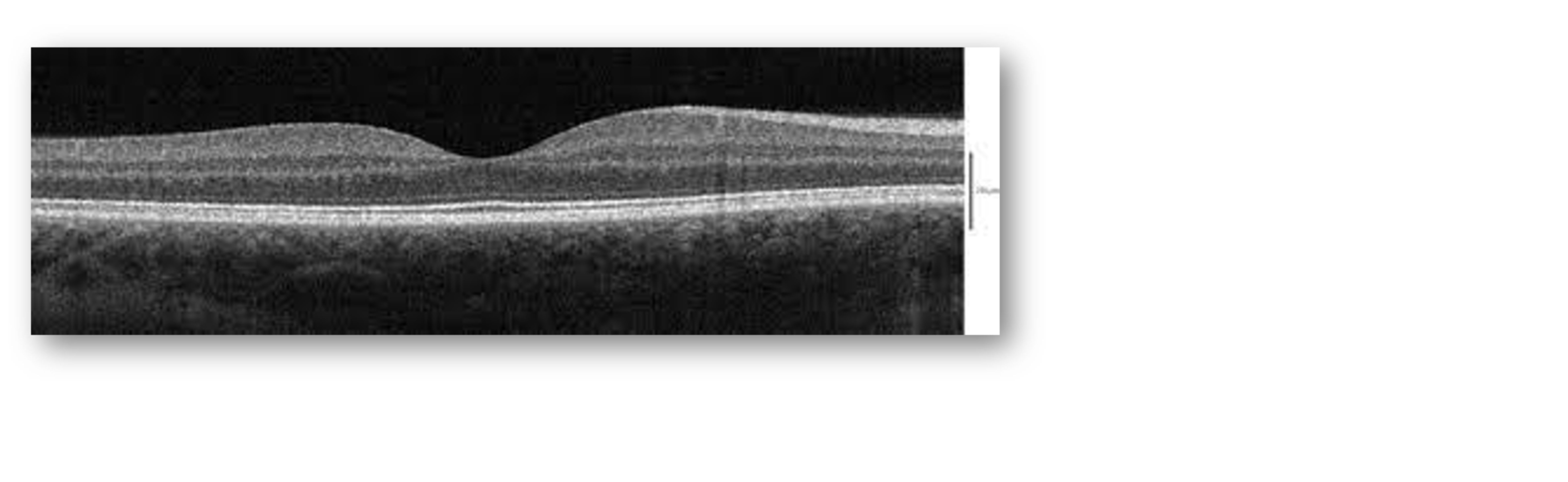 At the baseline exam, best corrected visual acuity was 20/20 OU, with normal pressures. I noted that he had mild non-proliferative diabetic retinopathy (NPDR), with a few microaneurysms that are barely evident on the fundus exam photos (Figure 1). Furthermore, the patient’s OCT looked normal (Figure 2).