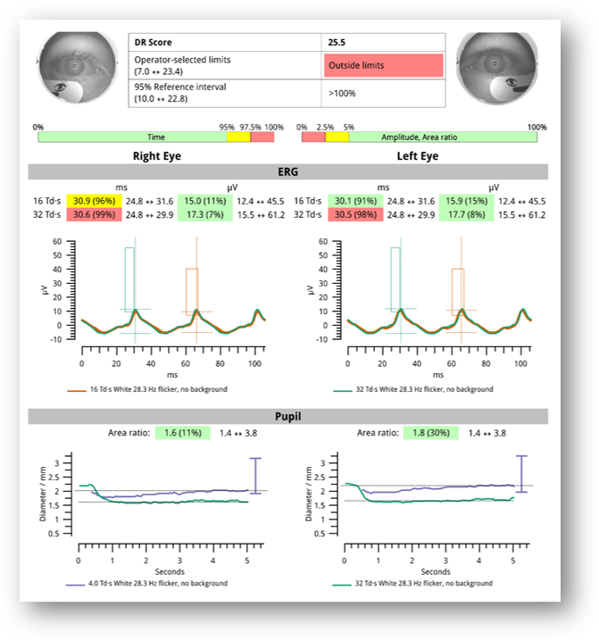The ERG returned an abnormal DR Score of 25.5 (Figure 4), indicating that the patient is at high risk of requiring a retinal intervention in the next 36 months. Looking more closely, we also see that the b-wave amplitude is at the lower end of the normal range and the patient has reduced implicit times, which indicate retinal stress.