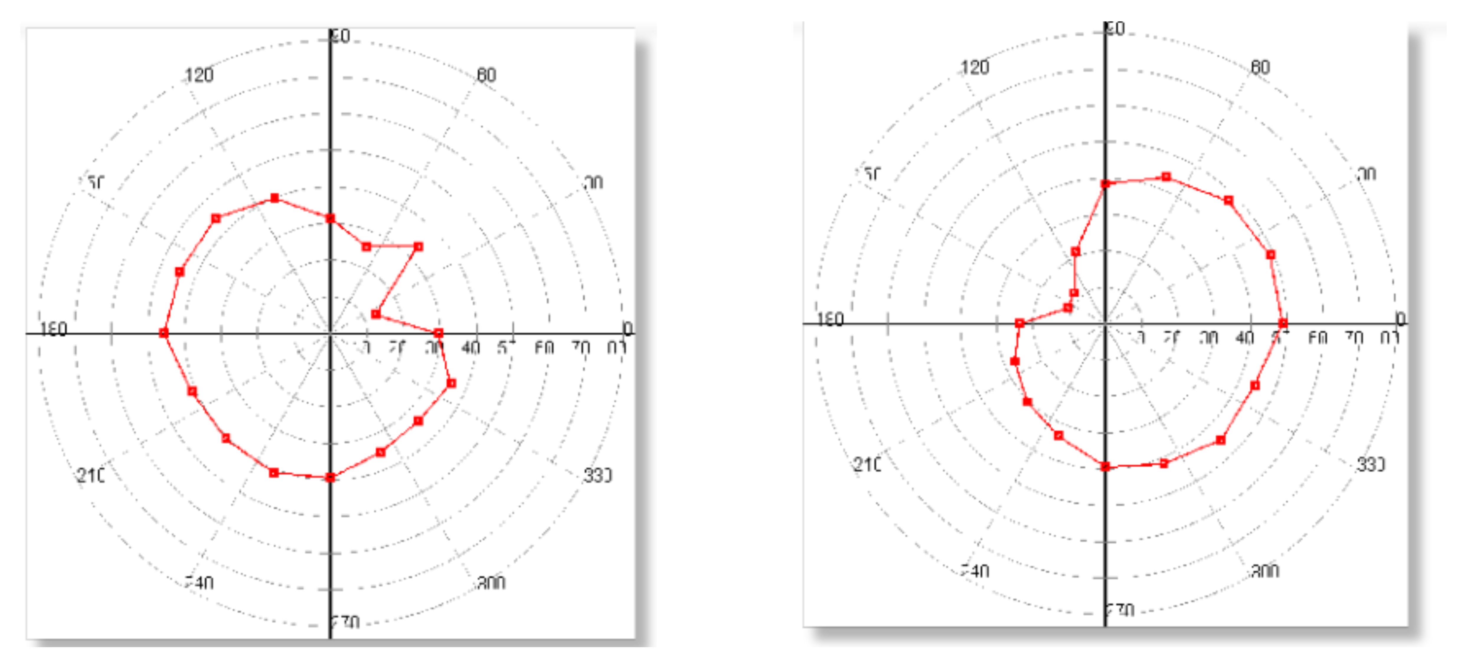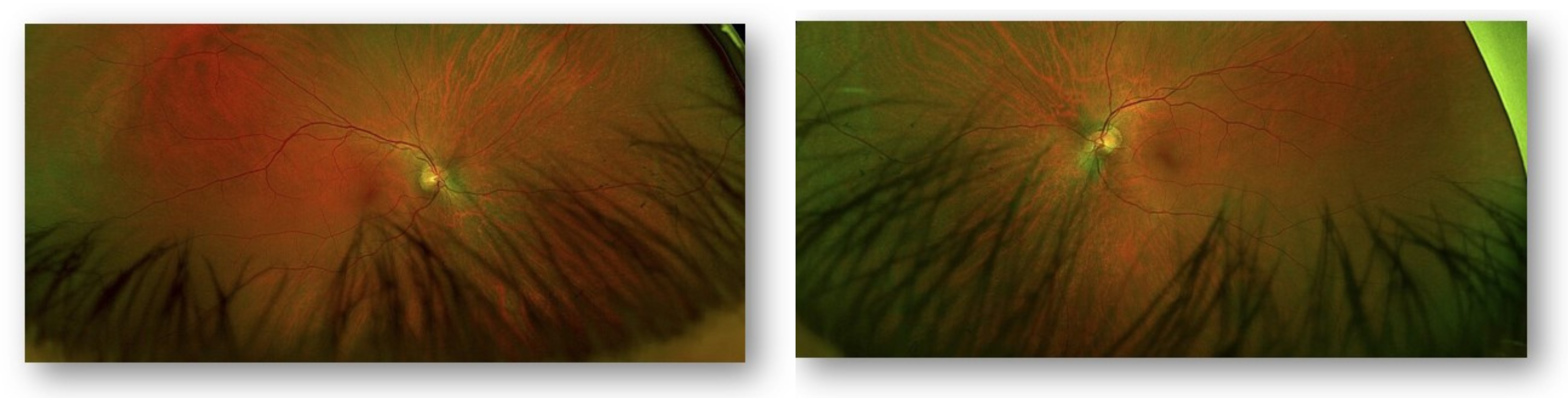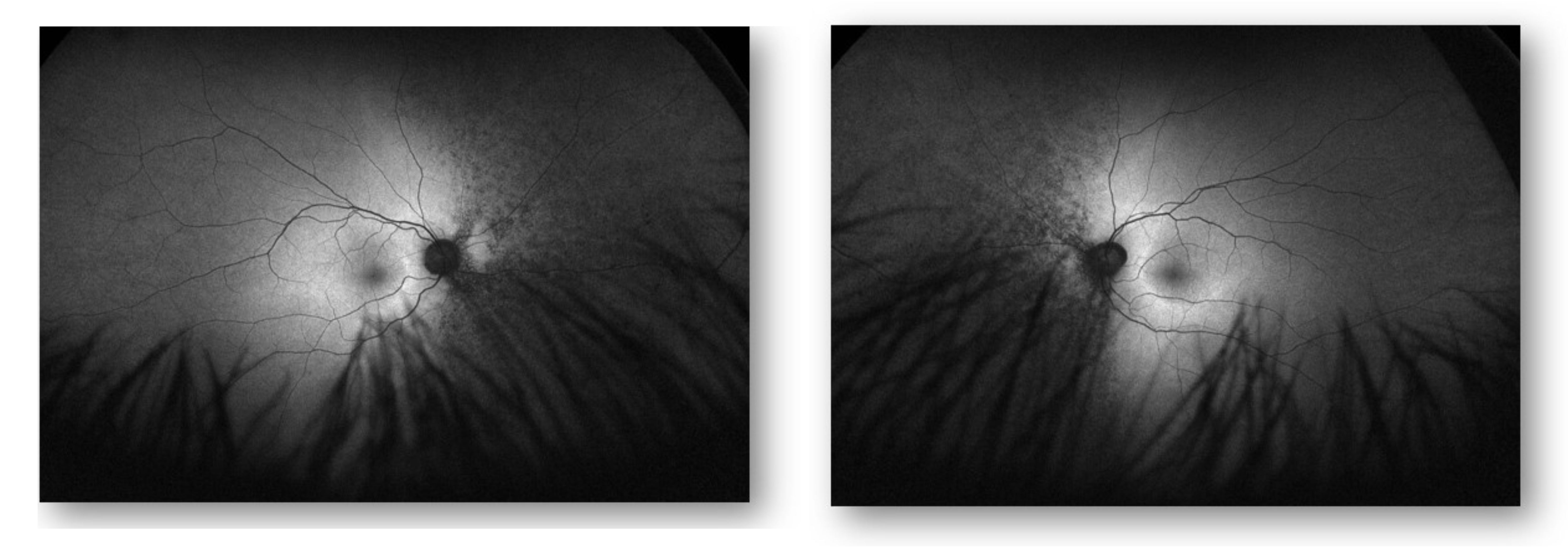 Fundus examination revealed some pigment changes nasally on both eyes (Figure 1). Upon further investigation, I realized that these were mild bone spicules, so we proceeded to capture auto fluorescence images. As the FAF images show, the patient had quite a bit of retinal loss in the nasal aspect of both retinas (Figure 2). A visual field further confirmed the presence of the nasal defect (Figure 3).