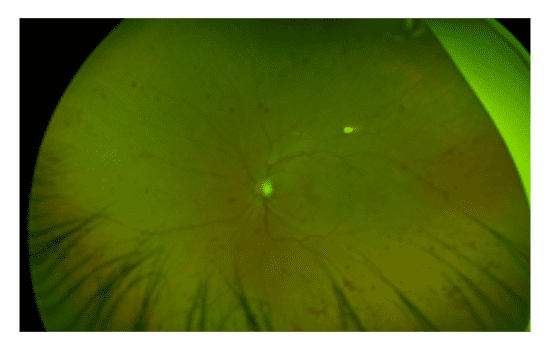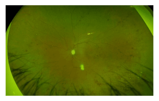 Following administration of a third anti-VEGF injection, the patient’s BCVA improved to 20/20. Additionally, retinal appearance showed signs of improvement, and the previously observed edema had resolved. To further assess retinal function, a repeat ERG was conducted, after one month and on the day of the first PRP session, revealing promising results. The implicit time decreased from 35.5 to 33.9 ms, indicating a positive response to treatment, albeit with residual ischemia. Moreover, there was a 50% recovery in amplitude (from 11.7 µV to 20.8 µV), suggesting enhanced retinal functioning after three injections and directly before laser treatment.