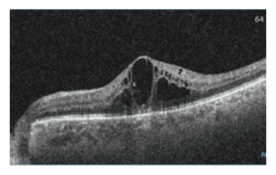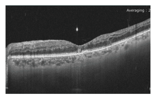 Three months later, the patient returned with unchanged retinal edema volume, but a deteriorated retinal appearance and slightly reduced visual acuity of 20/25. There was the concern that the CRVO had progressed to an ischemic state.