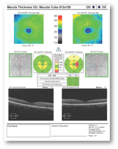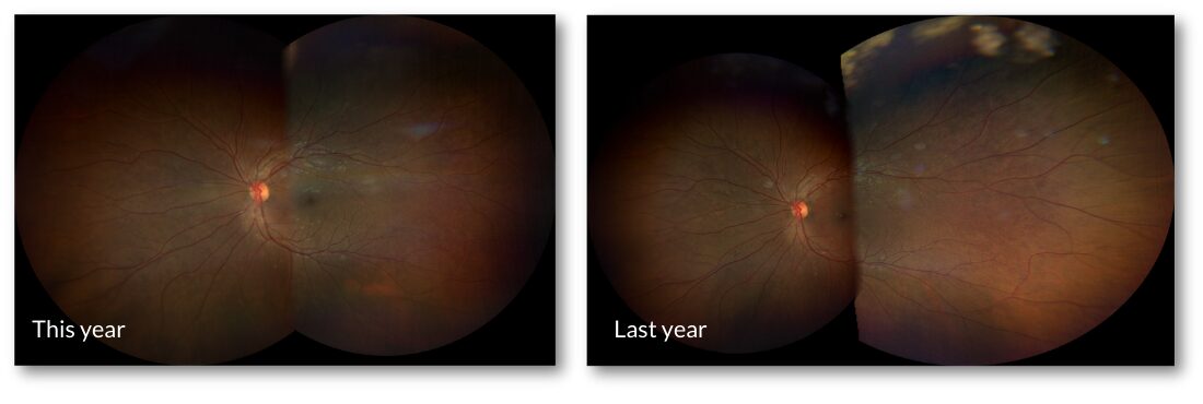 The photos show some progression, so we ran an OCT (Figure 3), which looks good overall, with no macular edema, no major macular ischemia or thinning.