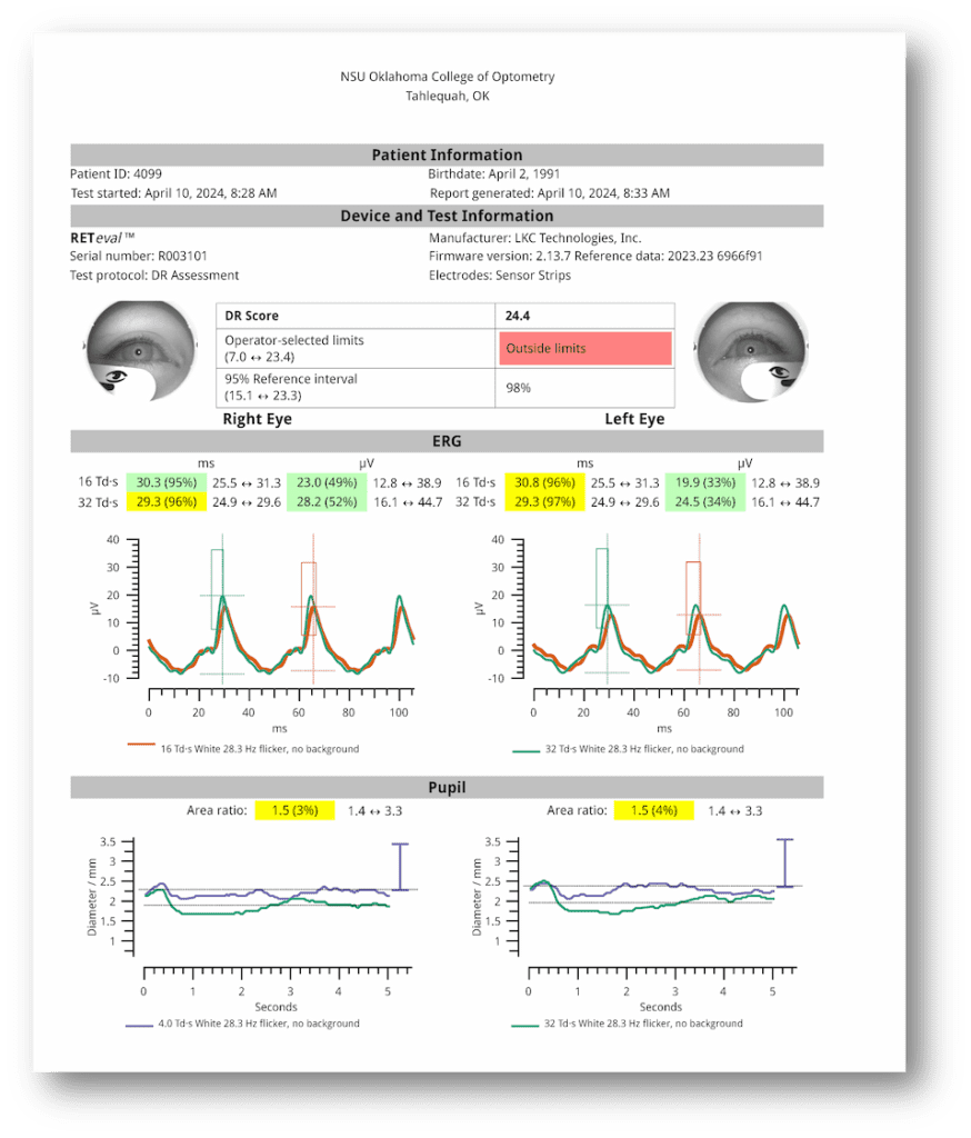 I began using ERG technology during my residency and was later invited to take over as the Chief of Electrodiagnostics by the Oklahoma College of Optometry in 2010. In 2023, we acquired our first RETeval device. We love it because it provides objective functional data that we can take right to the patient, and because the DR Assessment is performed on undilated eyes, the RETeval improves our patient flow. In just a few short minutes, you can obtain objective functional data for both eyes. This information gives me assurance about overall retinal function.