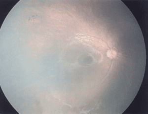 A 4-year-old boy presented to our office with nystagmus for further assessment of required tests or treatments. The visual acuity was tested and found to be 0.3 in Snellen measurement. Taking OCT and fundus pictures showed to be very difficult due to age and nystagmus. The obtained images though, did not show any signs of abnormality.